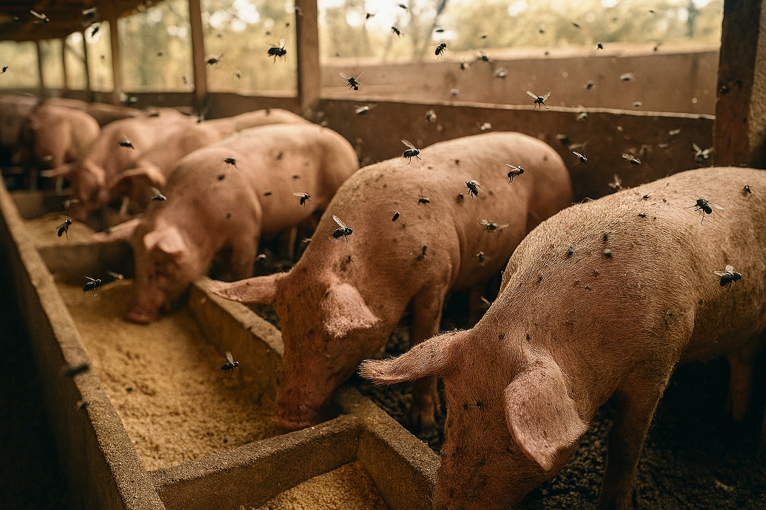 Flies contaminate feed, stress pigs, and harm farm hygiene.